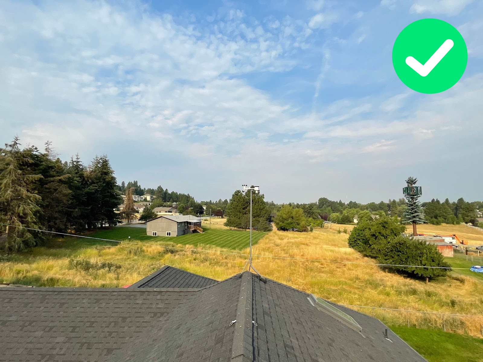 The station is deployed on an appropriate mast, but it is not at the highest possible point of the area (there is a higher building to the north and tall trees to the south). There is also a chimney below it.