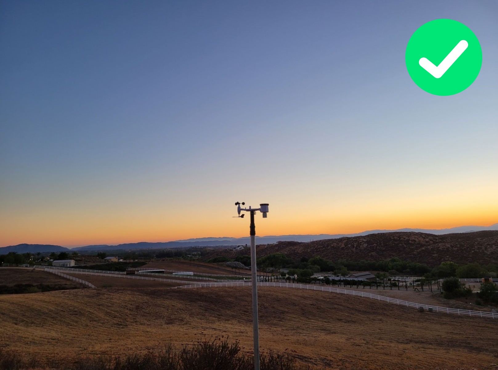 The station has been deployed at a 2.5m mast with a clear horizon with no obstacles. The only obstacle is a house (4-7m height) being located at the east, but it’s 25m away.Thus, the maximum difference of obstacle-station level heights is 7-2.5=4.5m, which means that the distance is at least >5 times the height of the obstacle. Although the station is considered as well deployed, optionally would be placed on a 5m mast to completely follow the WMO criteria.